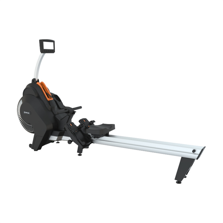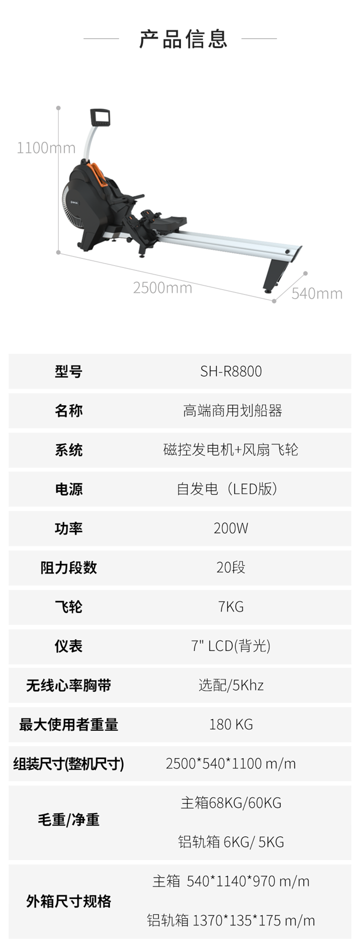 舒华商用划船机SH-R8800采用磁控发电机和风扇飞轮系统,设有20段阻力段数,其中飞轮重量是7kg。