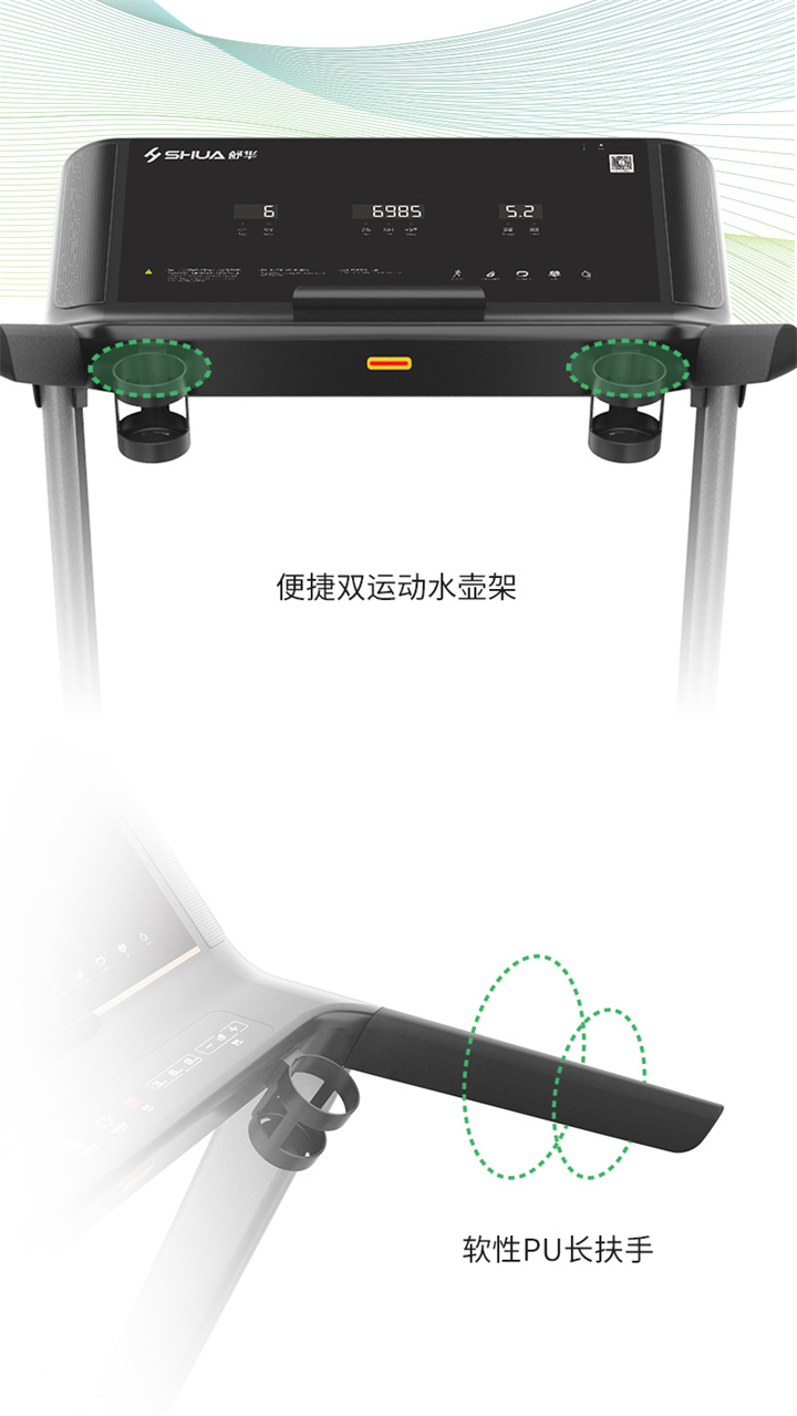 舒华家用跑步机SH-T6700(X6)采用18T+12T双层跑板,T2.2mm钻石纹的跑带,双层跑板全跑台减震,对您跑步中的膝盖进行全方位的呵护,选用接触式心率感应和无线心率感应等多种方式获取数据,跑步面积达520×1450mm,可承受130kg的使用者使用。